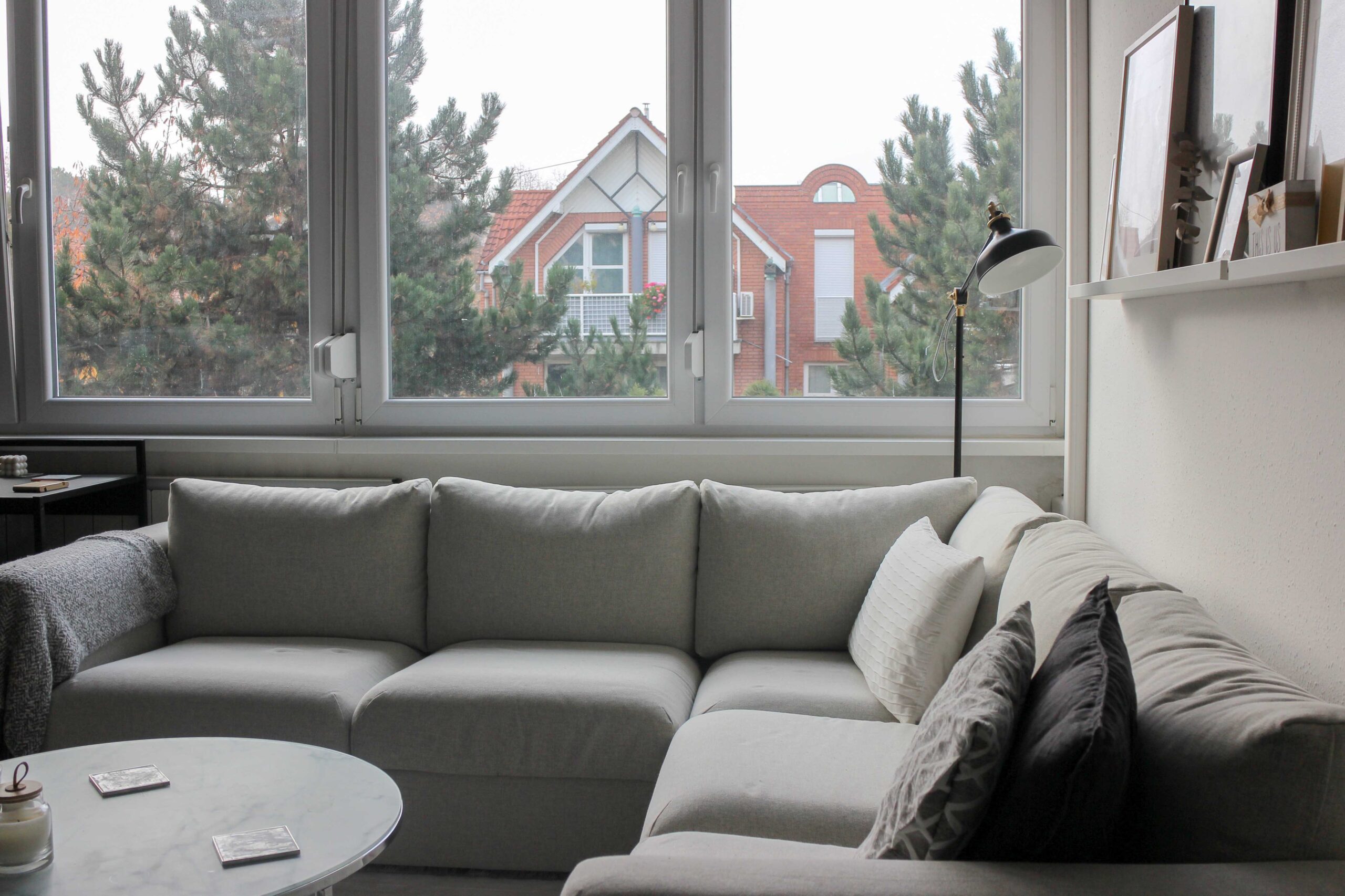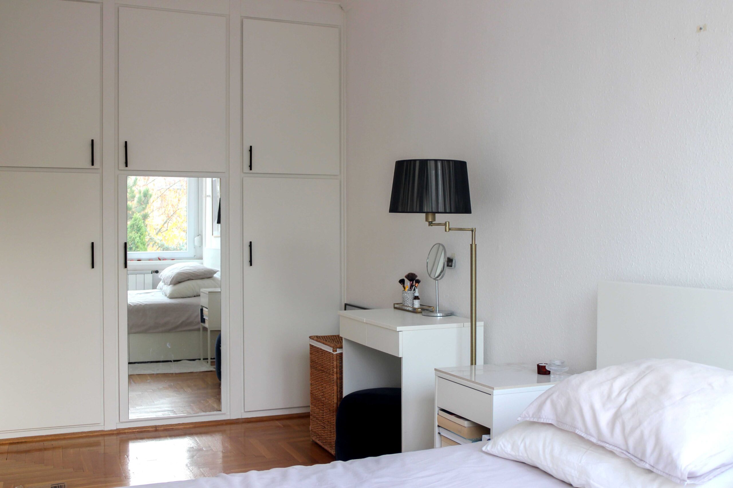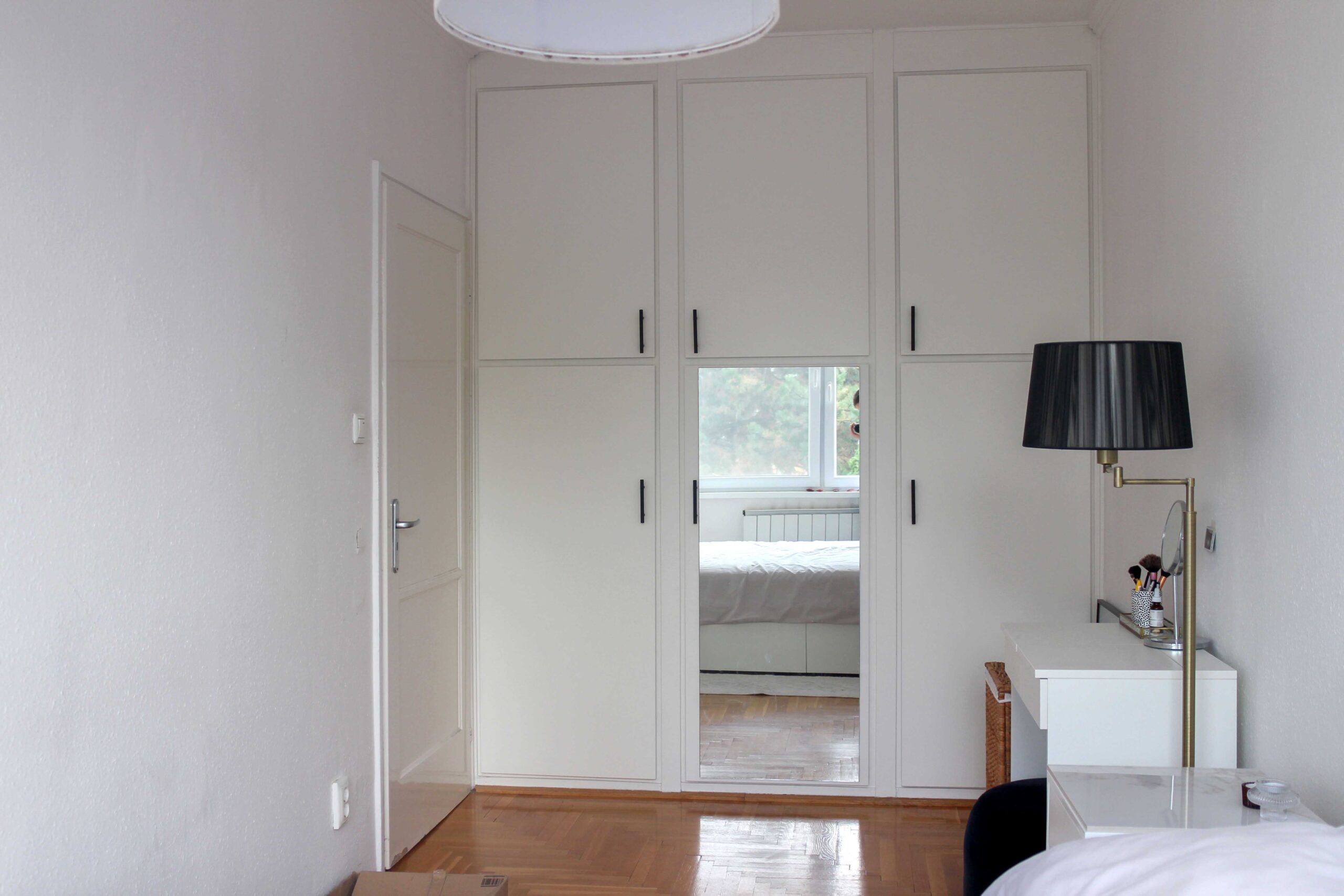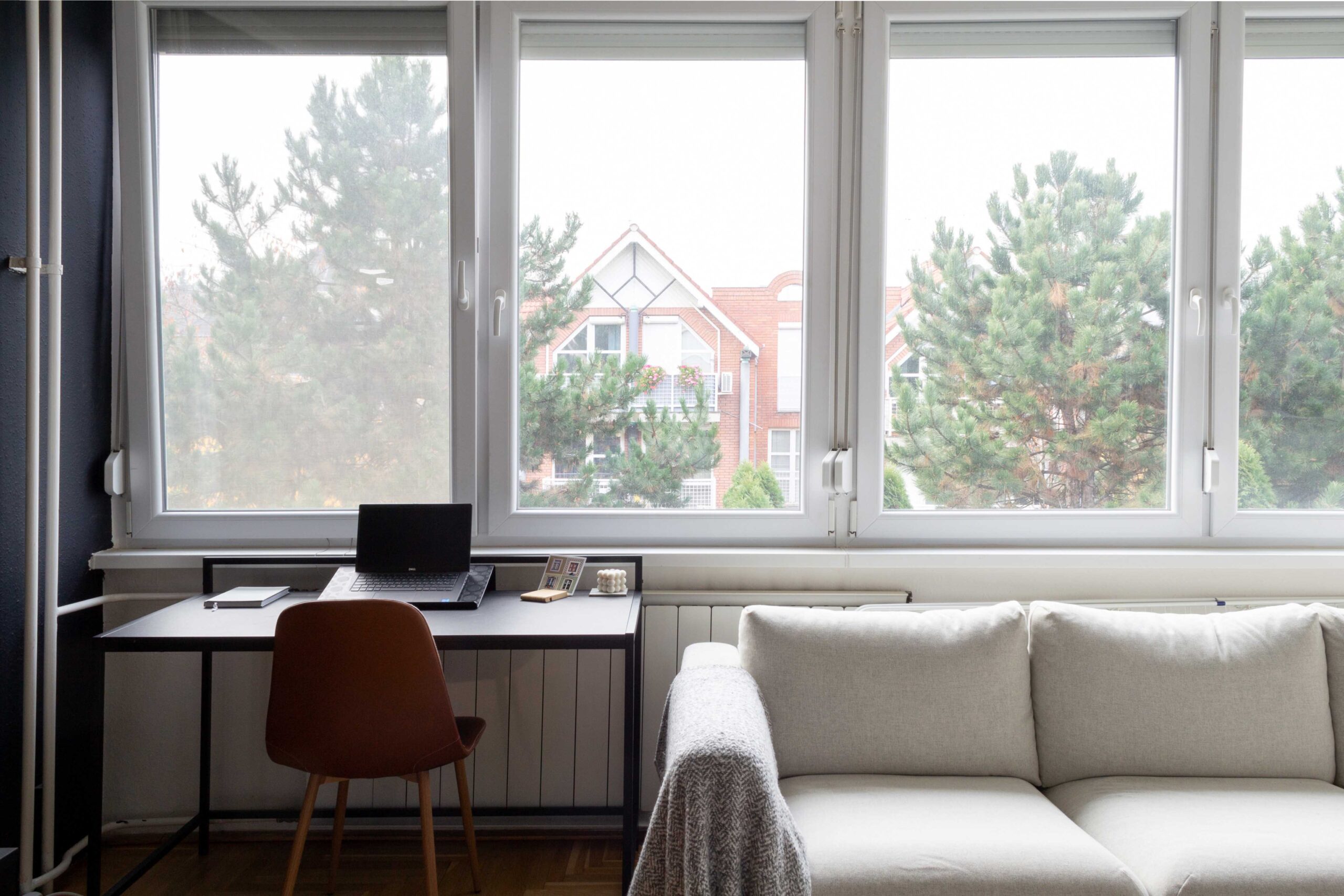 Egy igazi letisztult, minimalista lakás, ahol a fehér szín az uralkodó, tisztaságot és rendezettséget sugározva. A meghatározó fehér alapnak néhány neutrális kiegészítő és bútor ad kontrasztot és mélységet. Illetve egyetlen fókusz falat, a Tv mögötti nappali falat, szinte feketére festettünk. Ez a fekete visszaköszön néhány bútorban és kiegészítőben, ezen kívül csak a szürke és barna színek jelennek meg nagyobb mennyiségben a lakásban. Ezek adják a kontrasztot és a melegséget, utóbbit természetesen a fa anyagok, a barna műbőr és a természetes anyagok, mint a lámpabúrán és a virágkaspókon a bambusz. Mindenhol ahol meg tudtuk oldani, filigrán, lábakon álló, vékony lábú bútorokat választottunk, hogy növeljük a légiesség érzetét. A minimalizmus jegyében nincsen sok nyitott polc - ahol mégis, azokat szigorúan nem zsúfoljuk tele, és a szekrények lehetőség szerint padlótól plafonig érnek. A mai életvitelnek megfelelően kialakítottunk egy home office-t is a nappaliban, a lakás elhelyezkedésének és tájolásának köszönhetően természetes fénnyel és szuper kilátással.